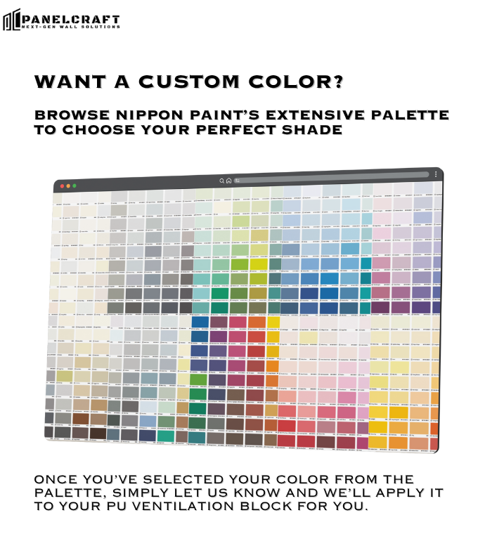 We use Nippon Paint’s extensive color palette so you can match any design theme — simply choose your perfect shade and we’ll coat your PU ventilation block for a truly unique finish.